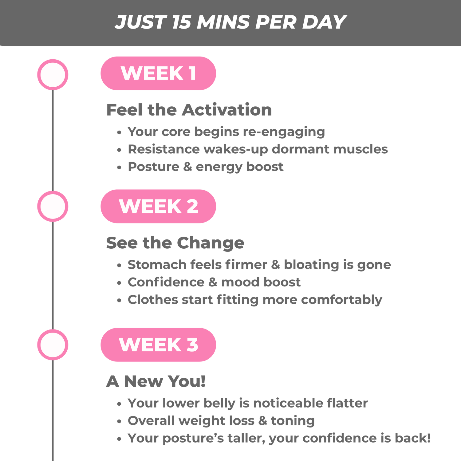 The resistance band activates your deep core muscles safely and effectively... you’ll feel it working from day one and see the difference within weeks of short, consistent use.